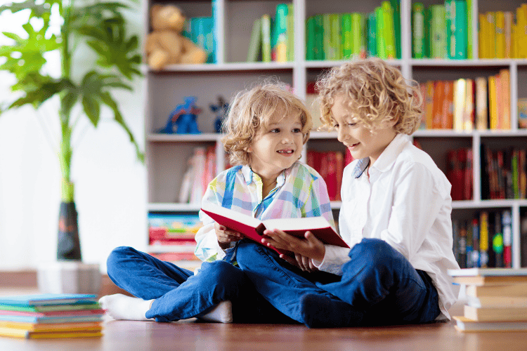 Alt text: Two children sitting on floor reading book together