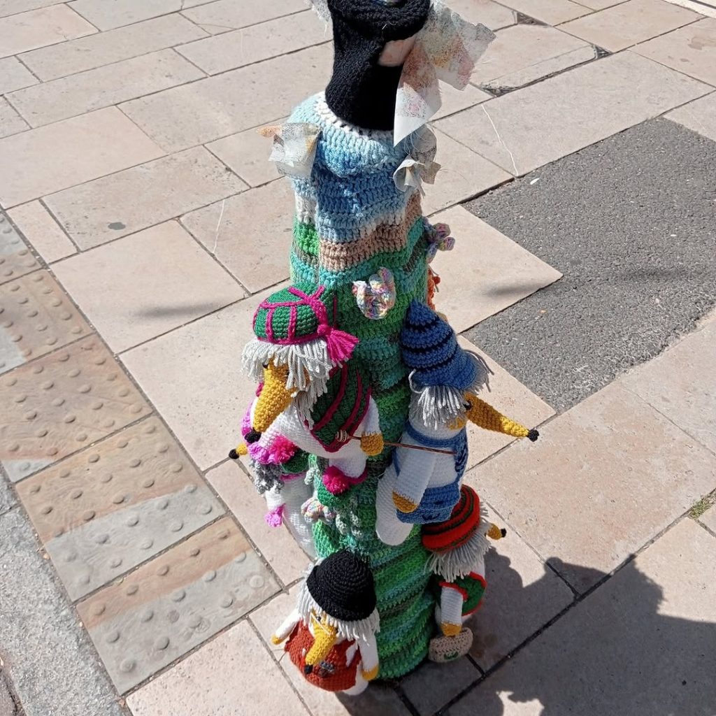 Christmas decorations on bollards outside Romsey Library